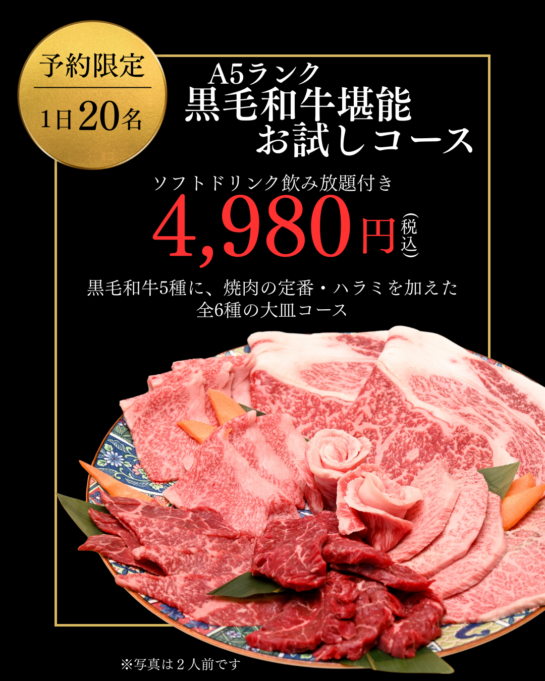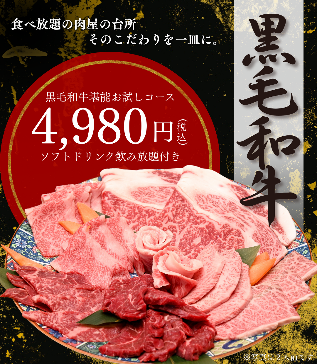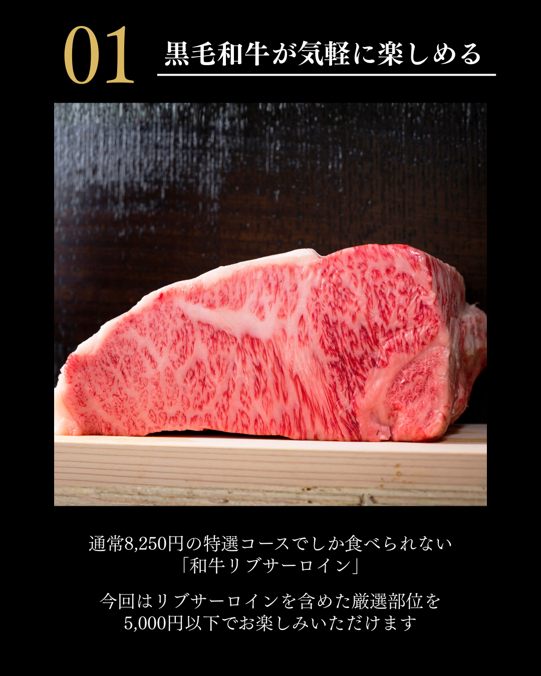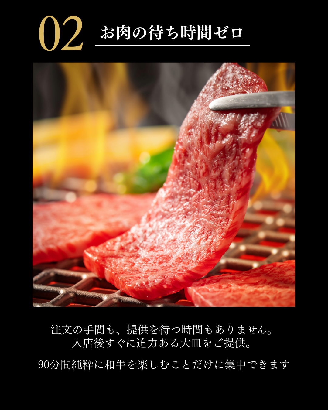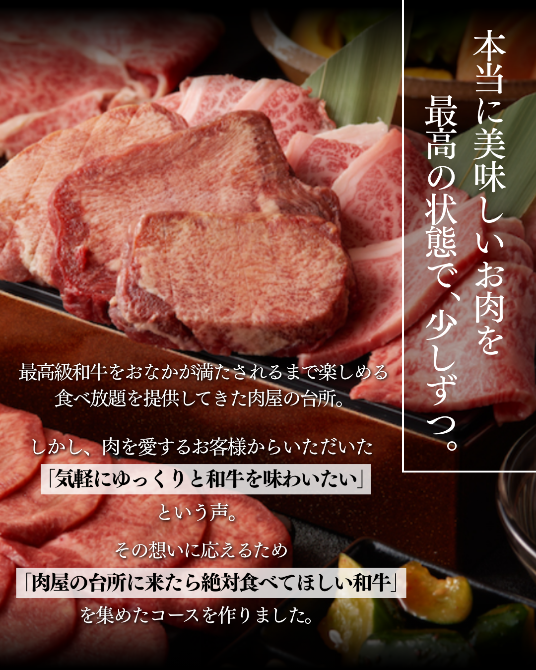 職人の目で厳選したA4・A5和牛の焼肉食べ放題をご提供。独自の仕入れルートと職人による手切りにより、高いコストパフォーマンスを実現しました。塊で仕入れ、手切りにこだわることで、驚きのコストパフォーマンスを維持しながらも、職人が一つ一つ丁寧に管理。上質なお肉を最高の状態でご提供いたします。
